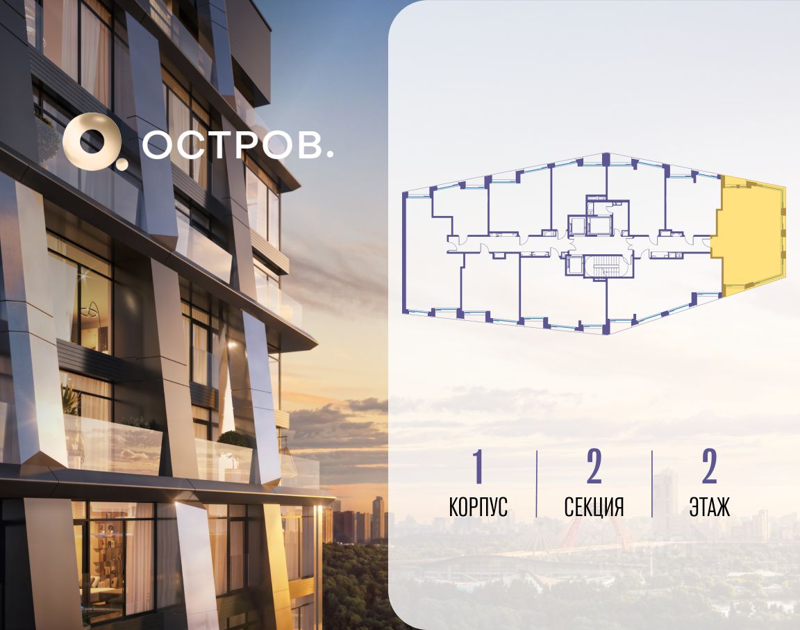 ОСТРОВ.12.1 - часть жилого комплекса на западе Москвы, в 15 минутах езды от центра. Это настоящий заповедник посреди большого города, в окружении реки и 650 га заповедников. Здесь все необходимое находится по соседству: от детского сада до супермаркета, от фитнес-зала до серфинг-центра. На территории созданы все условия для отдыха и общения: клубная инфраструктура в домах и дворы-парки, набережные и променады, маршруты для спортсменов, детей и возрастных жителей. В нескольких минутах ходьбы расположена станция метро "Мнёвники" БКЛ. На автомобиле - 10 минут до Москва-Сити и 15 минут до Садового кольца.