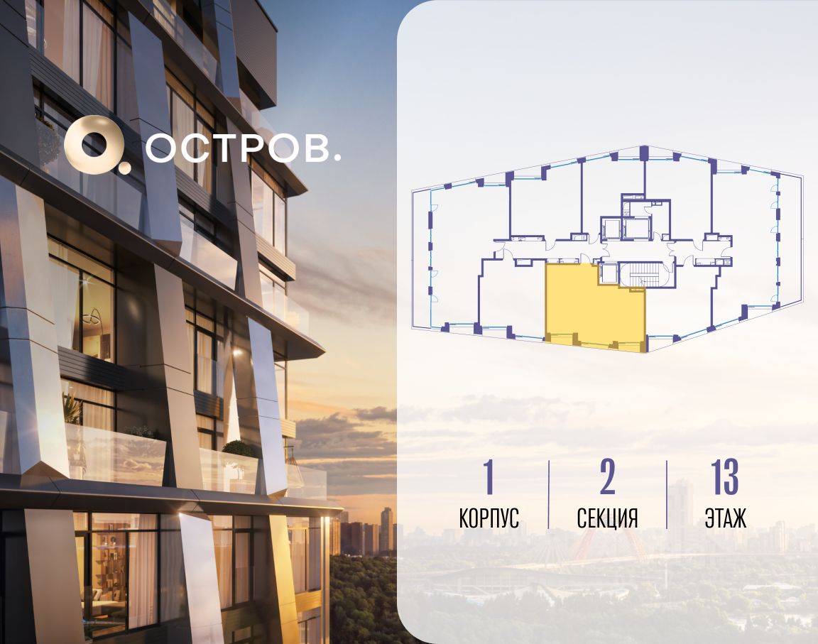 ОСТРОВ.12.1 - часть жилого комплекса на западе Москвы, в 15 минутах езды от центра. Это настоящий заповедник посреди большого города, в окружении реки и 650 га заповедников. Здесь все необходимое находится по соседству: от детского сада до супермаркета, от фитнес-зала до серфинг-центра. На территории созданы все условия для отдыха и общения: клубная инфраструктура в домах и дворы-парки, набережные и променады, маршруты для спортсменов, детей и возрастных жителей. В нескольких минутах ходьбы расположена станция метро "Мнёвники" БКЛ. На автомобиле - 10 минут до Москва-Сити и 15 минут до Садового кольца.