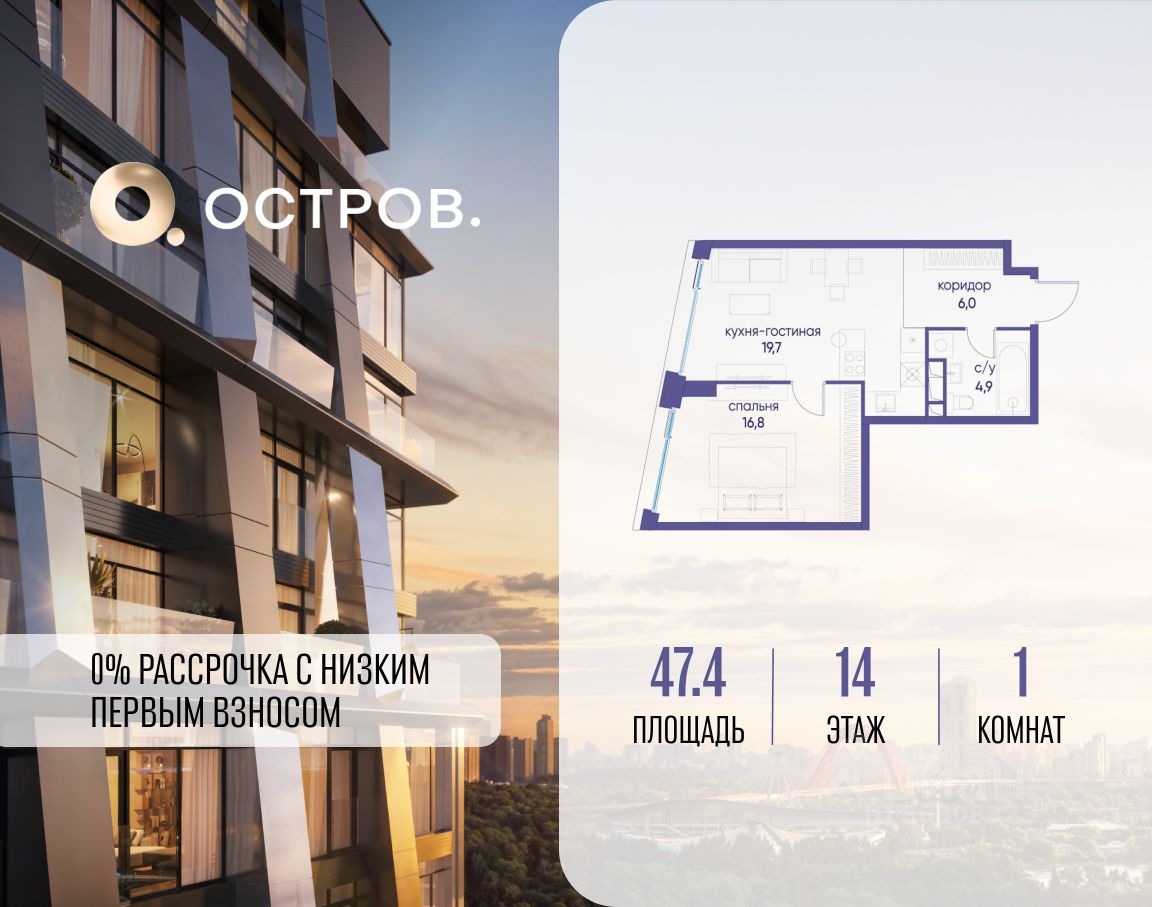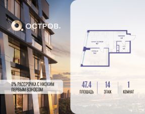 Продаётся однокомнатная квартира от застройщика: общая площадь 47.40 м², жилая 16.80 м², кухня 18.70 м², 14, жилой квартал "Остров 12", корпус 1 (12.1 квартал) (секция 2). срок сдачи: 4-кв. 2025.