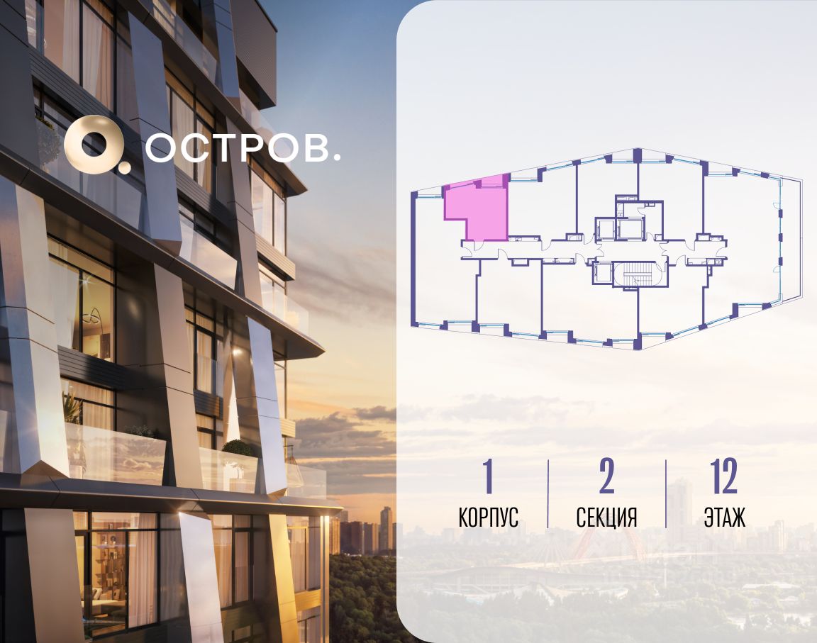 ОСТРОВ.12.1 - часть жилого комплекса на западе Москвы, в 15 минутах езды от центра. Это настоящий заповедник посреди большого города, в окружении реки и 650 га заповедников. Здесь все необходимое находится по соседству: от детского сада до супермаркета, от фитнес-зала до серфинг-центра. На территории созданы все условия для отдыха и общения: клубная инфраструктура в домах и дворы-парки, набережные и променады, маршруты для спортсменов, детей и возрастных жителей. В нескольких минутах ходьбы расположена станция метро "Мнёвники" БКЛ. На автомобиле - 10 минут до Москва-Сити и 15 минут до Садового кольца.
