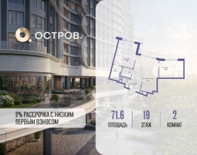 Продаётся двухкомнатная квартира от застройщика: общая площадь 71.60 м², жилая 32.10 м², кухня 26.10 м², 19, жилой квартал "Остров 7", корпус 7 (7 квартал) (секция 1). срок сдачи: 4-кв. 2025.