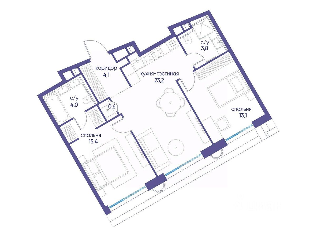 , 2 санузла: 2 совмещенных. В жилой зоне 2 больших окна на одну сторону, хорошая инсоляция.