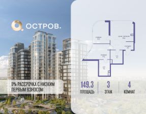 Продаётся 4-комн. квартира от застройщика: общая площадь 149.30 м², жилая 29.30 м², кухня 25.50 м², 3-й этаж, жилой квартал "Остров 12", корпус 2 (секция 1). Срок сдачи: 1 квартал 2029 года.