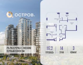Продаётся 3-комн. квартира от застройщика: общая площадь 117.20 м², жилая 58.80 м², кухня 30.70 м², 14-й этаж, жилой квартал "Остров 12", корпус 2 (секция 1). Срок сдачи: 1 квартал 2029 года.