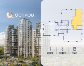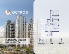Продаётся 2-комн. квартира от застройщика: общая площадь 74.40 м², жилая 26.30 м², кухня 26.00 м², 12-й этаж, жилой квартал "Остров 12", корпус 1 (секция 3). Срок сдачи: 1 квартал 2029 года.