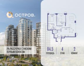 Продаётся 2-комн. квартира от застройщика: общая площадь 84.50 м², жилая 31.40 м², кухня 40.40 м², 4-й этаж, жилой квартал "Остров 12", корпус 1 (секция 1). Срок сдачи: 1 квартал 2029 года.