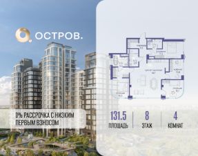 Продаётся 4-комн. квартира от застройщика: общая площадь 131.50 м², жилая 59.30 м², кухня 46.10 м², 8-й этаж, жилой квартал "Остров 12", корпус 1 (секция 3). Срок сдачи: 1 квартал 2029 года.