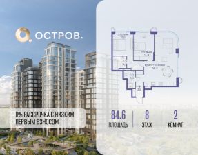 Продаётся 2-комн. квартира от застройщика: общая площадь 84.60 м², жилая 31.90 м², кухня 40.40 м², 8-й этаж, жилой квартал "Остров 12", корпус 1 (секция 1). Срок сдачи: 1 квартал 2029 года.