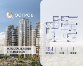 Продаётся 4-комн. квартира от застройщика: общая площадь 131.40 м², жилая 59.20 м², кухня 46.10 м², 4-й этаж, жилой квартал "Остров 12", корпус 1 (секция 3). Срок сдачи: 1 квартал 2029 года.