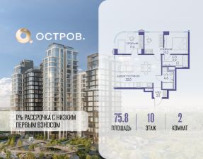 Продаётся 2-комн. квартира от застройщика: общая площадь 75.80 м², жилая 30.80 м², кухня 32.00 м², 10-й этаж, жилой квартал "Остров 12", корпус 1 (секция 3). Срок сдачи: 1 квартал 2029 года.
