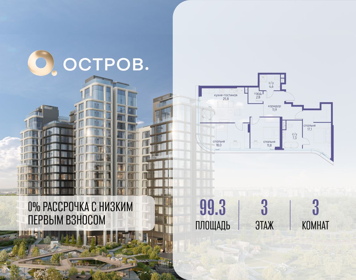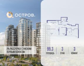 Продаётся 3-комн. квартира от застройщика: общая площадь 99.30 м², жилая 46.90 м², кухня 25.80 м², 3-й этаж, жилой квартал "Остров 12", корпус 6 (секция 1). Срок сдачи: 1 квартал 2029 года.