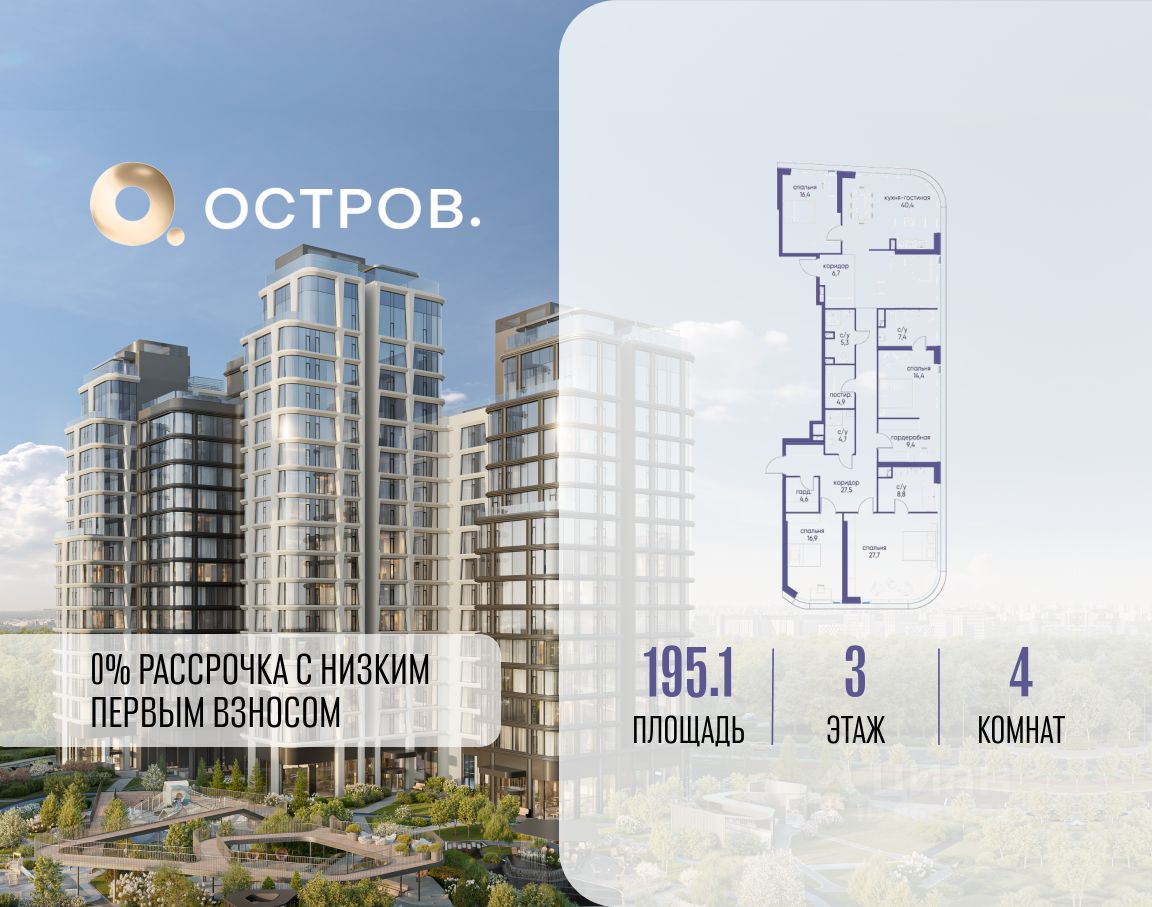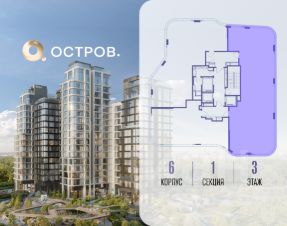 Продаётся 4-комн. квартира от застройщика: общая площадь 195.10 м², жилая 75.40 м², кухня 40.40 м², 3-й этаж, жилой квартал "Остров 12", корпус 6 (секция 1). Срок сдачи: 1 квартал 2029 года.