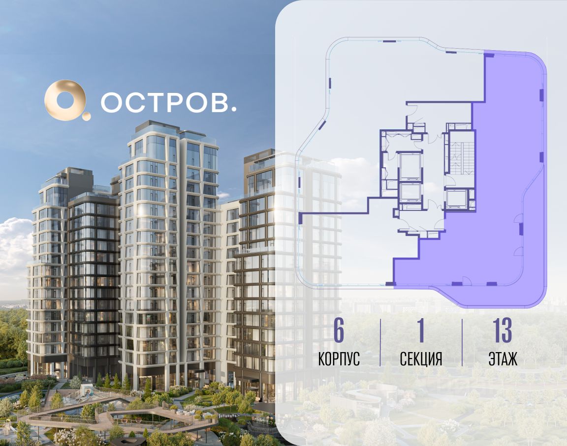 Продаётся 4-комн. квартира от застройщика: общая площадь 176.30 м², жилая 55.30 м², кухня 36.80 м², 13-й этаж, жилой квартал "Остров 12", корпус 6 (секция 1). Срок сдачи: 1 квартал 2029 года.