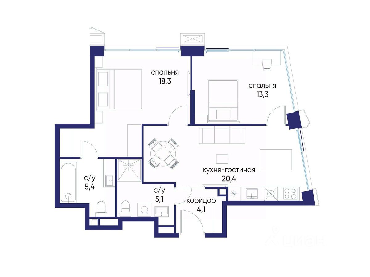 2 совмещенных санузла.