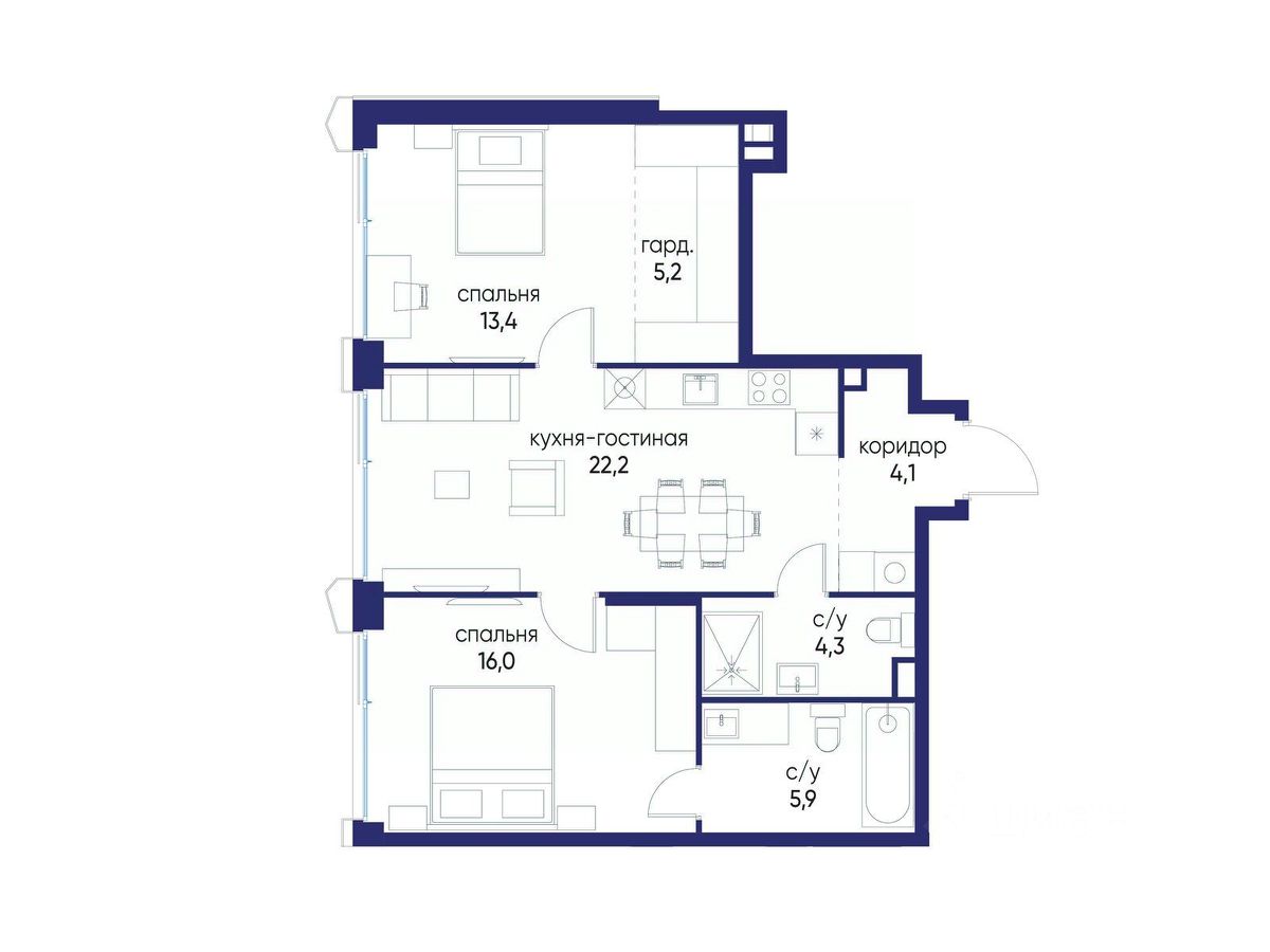 2 совмещенных санузла.