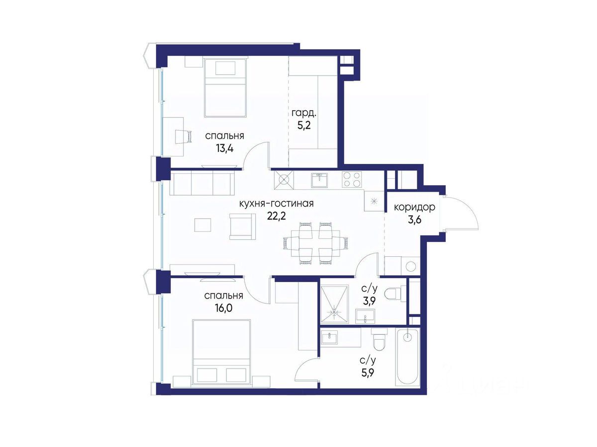 2 совмещенных санузла.