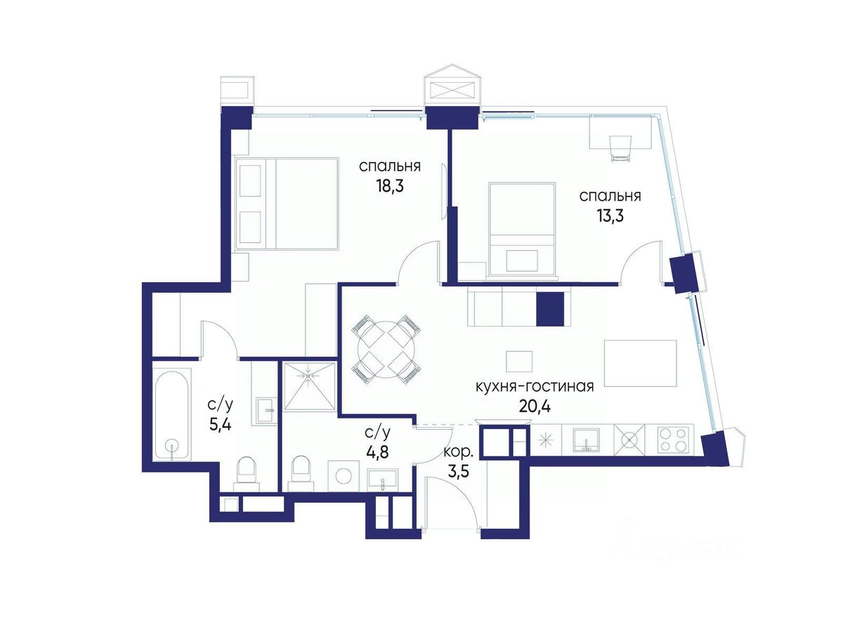 2 совмещенных санузла.