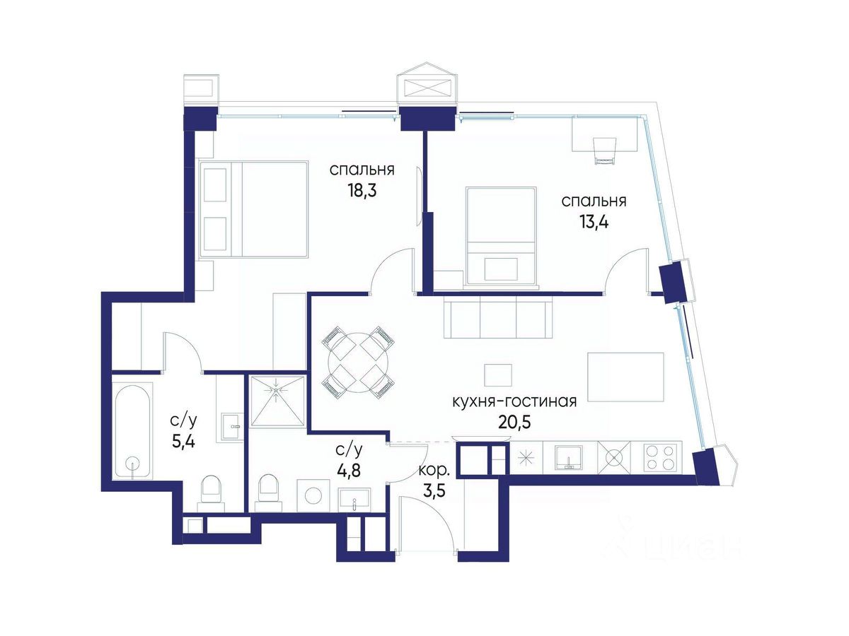 2 совмещенных санузла.