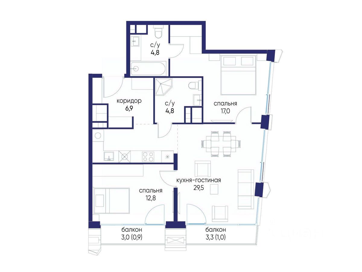 Продаётся 2-комн. квартира от застройщика: общая площадь 77.70 м², жилая 29.80 м², кухня 29.50 м², 14-й этаж, жилой квартал "Остров 14", корпус 6 (секция 1). Срок сдачи: 2 квартал 2029 года.