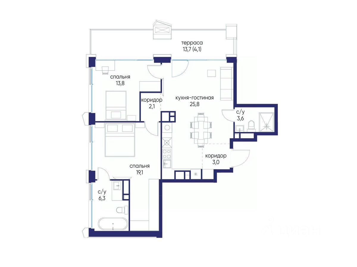 2 совмещенных санузла.