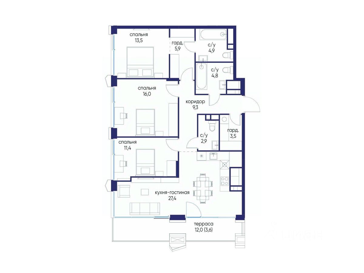 Продаётся 3-комн. квартира от застройщика: общая площадь 103.20 м², жилая 40.90 м², кухня 27.40 м², 20-й этаж, жилой квартал "Остров 14", корпус 6 (секция 1). Срок сдачи: 2 квартал 2029 года.