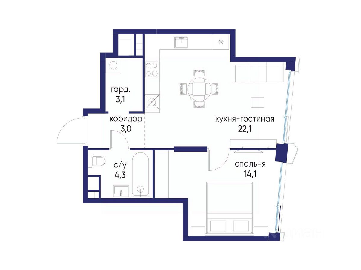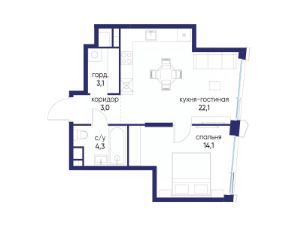 Продаётся 1-комн. квартира от застройщика: общая площадь 46.60 м², жилая 14.10 м², кухня 22.10 м², 11-й этаж, жилой квартал "Остров 14", корпус 6 (секция 1). Срок сдачи: 2 квартал 2029 года.