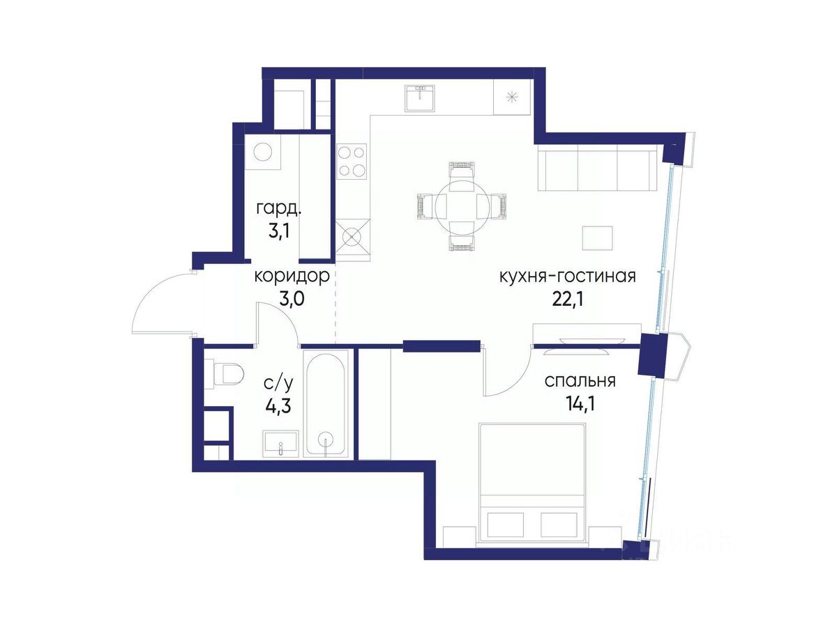 Продаётся 1-комн. квартира от застройщика: общая площадь 46.60 м², жилая 14.10 м², кухня 22.10 м², 12-й этаж, жилой квартал "Остров 14", корпус 6 (секция 1). Срок сдачи: 2 квартал 2029 года.