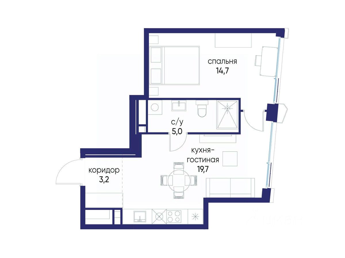 Продаётся 1-комн. квартира от застройщика: общая площадь 42.60 м², жилая 14.70 м², кухня 19.70 м², 18-й этаж, жилой квартал "Остров 14", корпус 6 (секция 1). Срок сдачи: 2 квартал 2029 года.