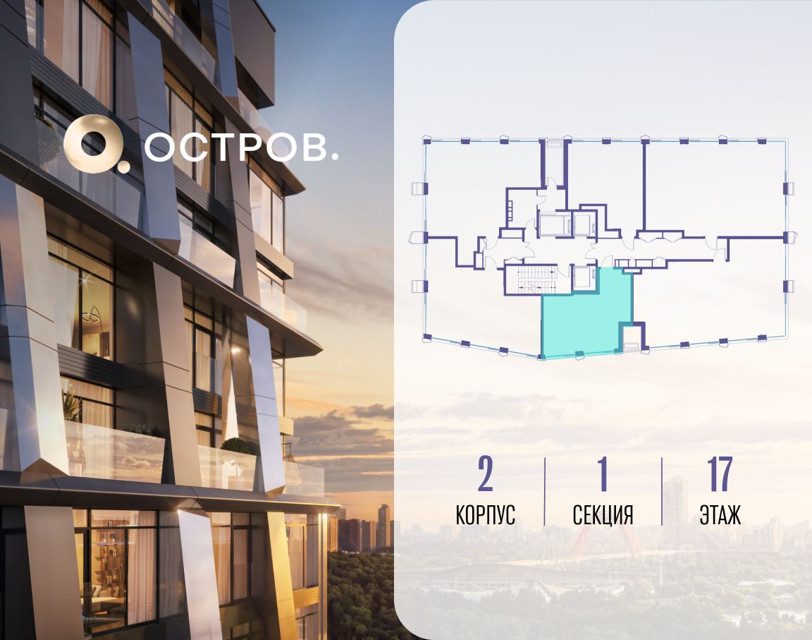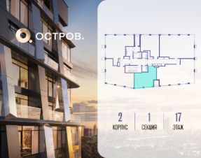 Продаётся 1-комн. квартира от застройщика: общая площадь 42.20 м², жилая 14.50 м², кухня 19.10 м², 17-й этаж, жилой квартал "Остров 12", корпус 2 (секция 1). Срок сдачи: 1 квартал 2029 года.
