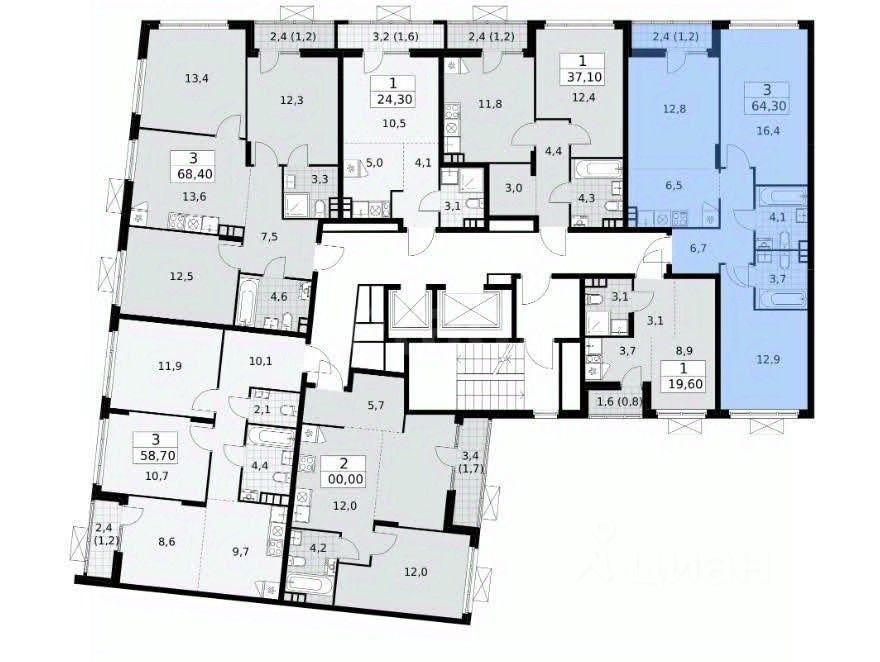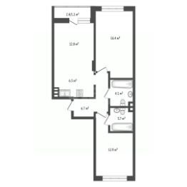 Квартира располагается на 4 этаже. Общая площадь 64,3 м2. Функциональная планировка - распашонка, большая кухня-гостиная 19,3 м2.