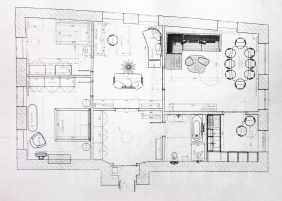 Планировка включает в себя гостиную 33 кв.м, две спальни (23 и 22) кв.м., кабинет 12.5 кв.м, прихожую 15 кв.м и кухню 11 кв.м. В мастер спальне действующий камин. Большая ванная комната. В ванной: большая столешница с раковиной, ванная, душевая кабина, унитаз-биде.
