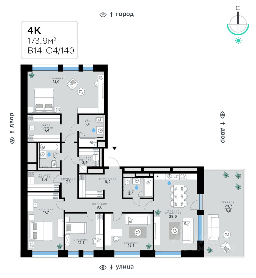 В продаже — четырехкомнатная квартира, общей площадью 173,9 кв. м. Квартира расположена на десятом этаже десятиэтажного корпуса Оптимум в квартале В14 нового района СберСити, который строит Сбер.