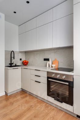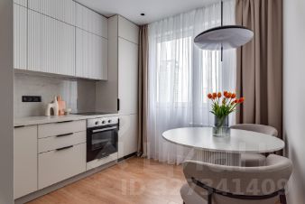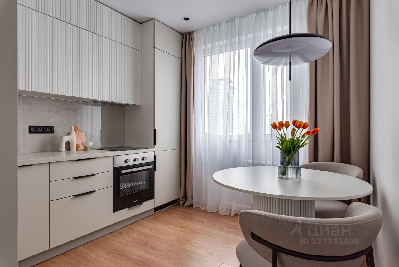 На комфортной вместительной кухне установлена новая техника: встроенный холодильник, посудомоечная машина, электрический духовой шкаф, индукционная варочная панель, полновстраеваемая вытяжка.