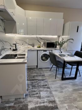 В студии выполнен современный ремонт в светлых тонах: в комнате обои, в гостиной зоне ламинат, а кухонной зоне и коридоре плитка, в кухонной зоне пол с подогревом, санузел выложен плиткой, везде натяжной потолок, пластиковые окна с тройным стеклопакетом. Широкий подоконник можно использовать в качестве дополнительного места для отдыха или хранения вещей.