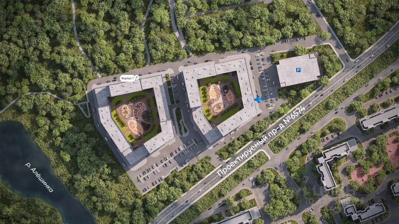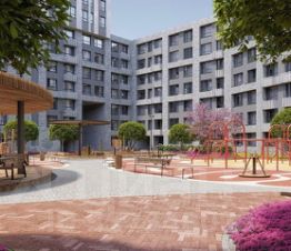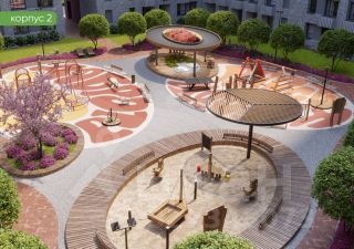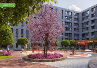 Закрытый двор, ландшафтное озеленение, зоны отдыха и детские площадки. Наземная парковка.