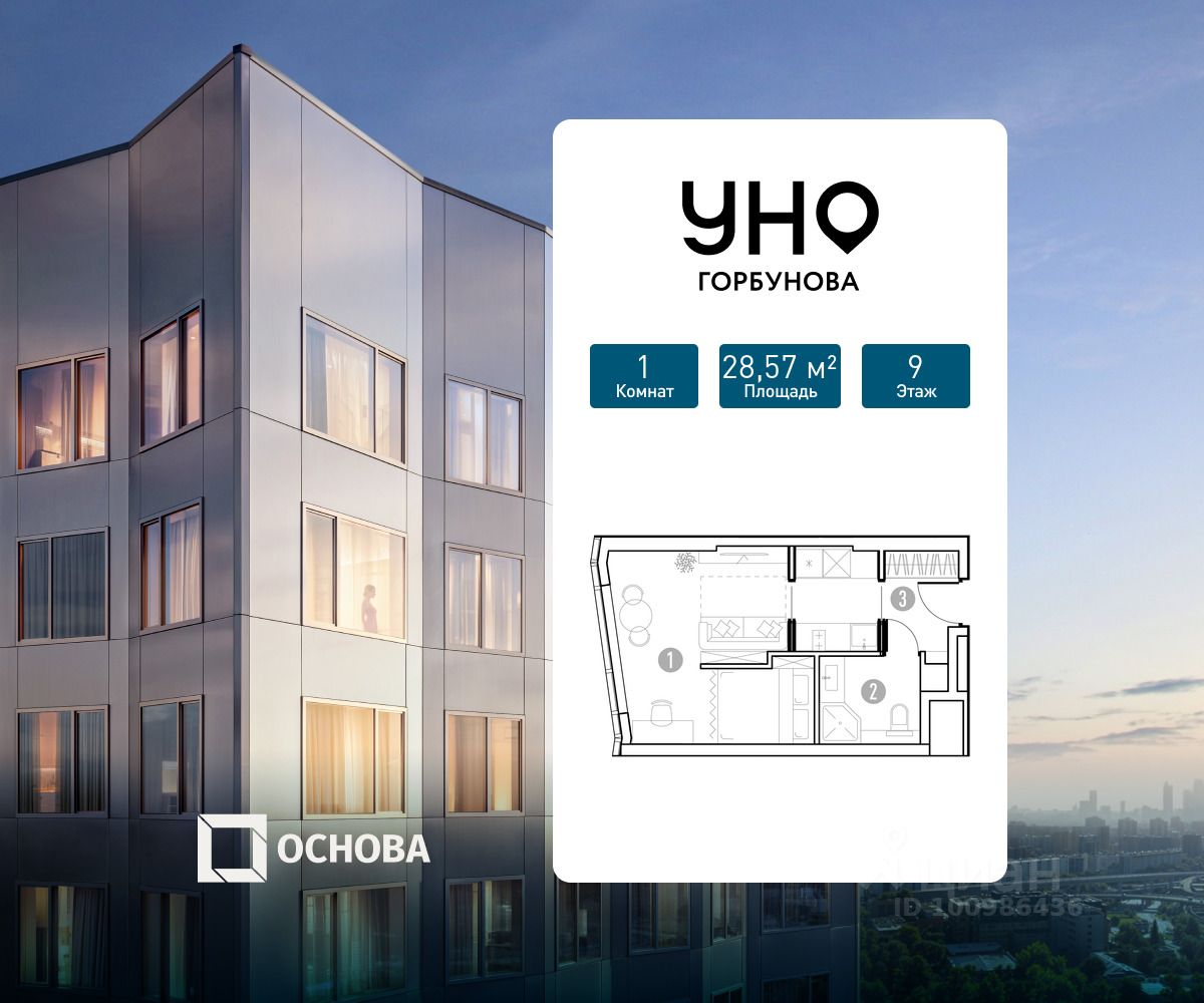 Продается 1-к квартира площадью 28.57 кв.м. на 9-м этаже 35 этажного дома в ЖК "УНО Горбунова" от ГК ОСНОВА. Старт продаж!
