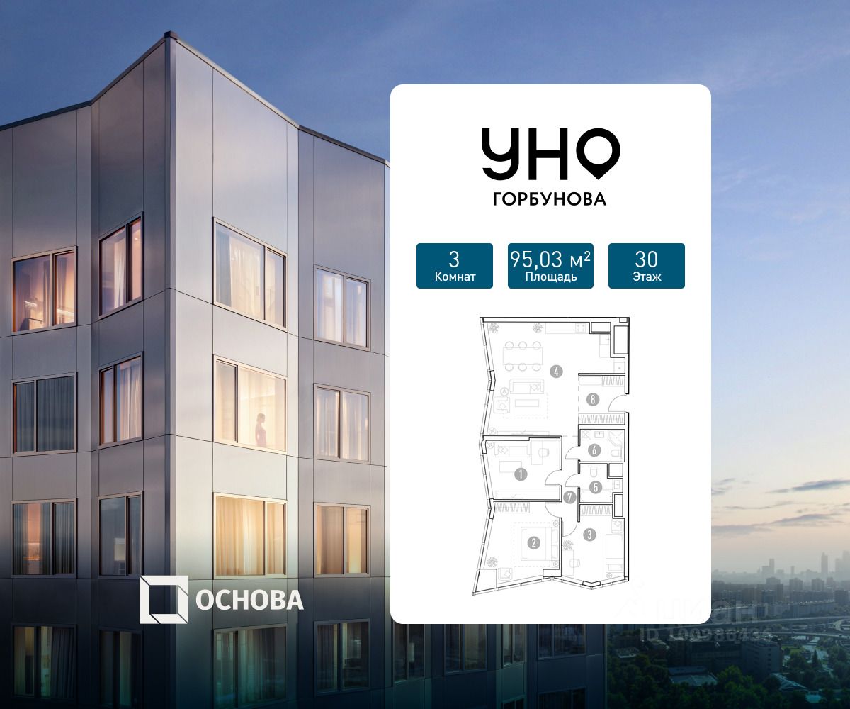 Продается 3-к квартира площадью 95.03 кв.м. на 30-м этаже 35 этажного дома в ЖК "УНО Горбунова" от ГК ОСНОВА. Старт продаж!