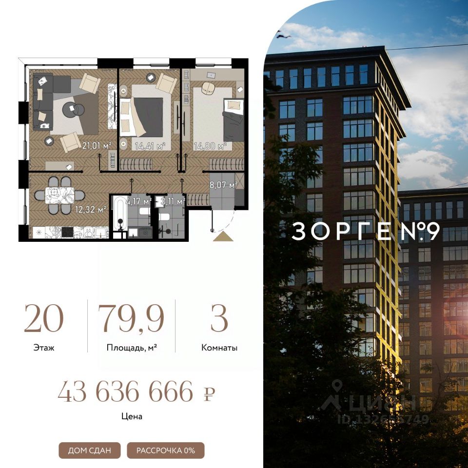 "Зорге 9" — готовые апартаменты бизнес-класса на Ходынке. 10 минут до Москва-Сити. Архитектура: 3 современных корпуса с фасадами в стиле архитектуры Нью-Йорка и с сервисами премиальных отелей, высотой до 23 этажа. Строгие линии, панорамные окна создают ощущение неподдельной роскоши и комфортной жизни в сердце мегаполиса. Проект награжден авторитетной премией European Property Awards. Резиденции: Свободная планировка, небольшая глубина этажа, огромные панорамные окна в пол до 3,6 м и высота потолков до от 3,3 до 4,3 м позволяют реализовать самые смелые концептуальные идеи и создать идеальный интерьер с учетом всех пожеланий. Вдохновляющие виды на город украсят ваш апартамент лучше любой картины. Есть возможность приобретения дизайн-проекта и полной меблировки апартаментов от партнеров девелопера. Расположение: 3 мин. пешком до парка Березовая роща 10 мин. пешком до Ходынского поля 10 мин. до ТЦ Авиапарк 30 минут до Шереметьево 10 мин до Москва-Сити или 1 станция до Москва-Сити 5 минут до ТТК 4 станции метро в шаговой доступности: 6 мин м. Полежаевская (фиолетовая ветка) 7 мин МЦК Зорге (МЦК) 7 мин м. Хорошевская (голубая ветка) 10 мин МЦК Хорошёво (МЦК) Благоустройство: Собственный парк 2 га с амфитеатром и поющими фонтанами. В парке высажено 136 деревьев и более 11 000 кустов и мелких растений из немецких питомников. Площадка для йоги и воркаут-зона со спортивными площадками. Теннисные столы и детский плейхаб Две башни Авторское гранд-лобби В лобби предусмотрена лаундж-зона, чайная с камином, комната для хранения велосипедов и колясок. Доступ по системе FACE ID. В отделке лобби и лифтовых холлов использован декоративный камень итальянского бренда Atlas Concorde Пентхаусы На верхнем уровне комплекса расположены роскошные просторные пентхаусы с высотой потолка до 4,2 метра и панорамными окнами до 3,6 метров, открывающими великолепные виды на столицу. Пентхаусы с выходами на собственные приватные террасы на кровле, площадью от 150 кв. м являются жильем high-уровня, демонстрирующим высокий статус владельца.