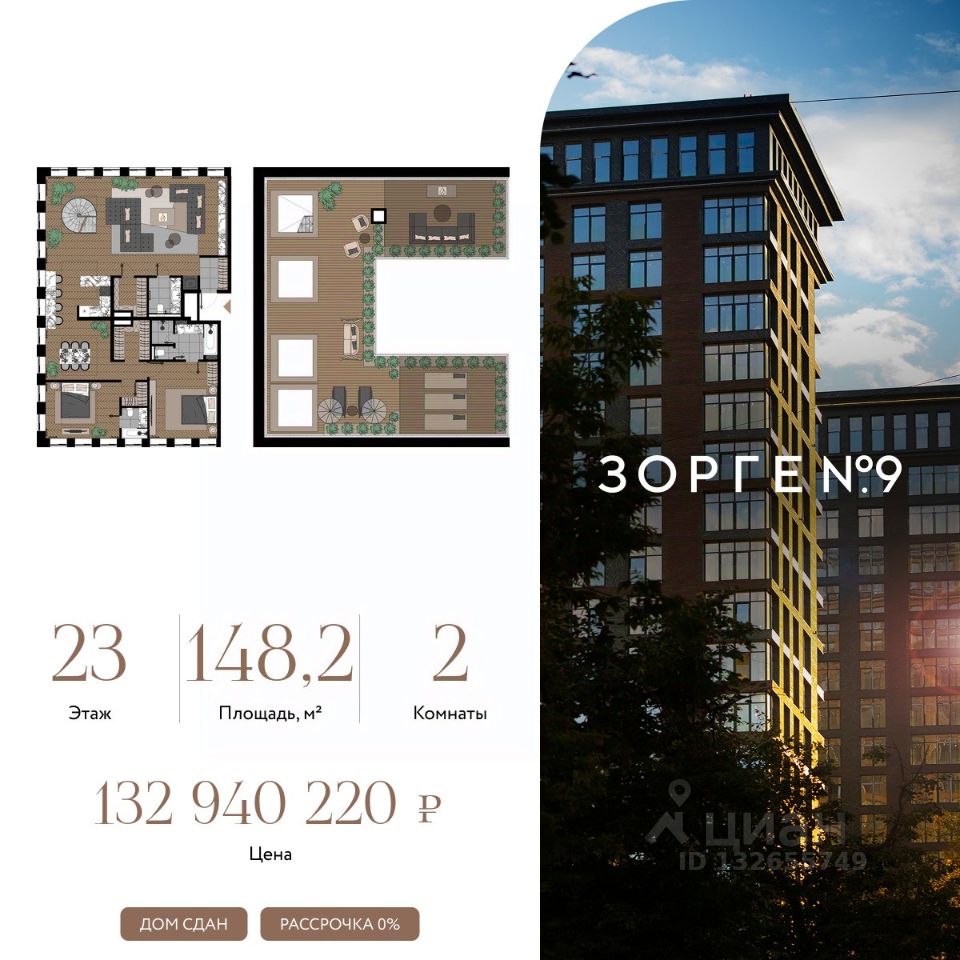 "Зорге 9" — готовые апартаменты бизнес-класса на Ходынке. 10 минут до Москва-Сити. Архитектура: 3 современных корпуса с фасадами в стиле архитектуры Нью-Йорка и с сервисами премиальных отелей, высотой до 23 этажа. Строгие линии, панорамные окна создают ощущение неподдельной роскоши и комфортной жизни в сердце мегаполиса. Проект награжден авторитетной премией European Property Awards. Резиденции: Свободная планировка, небольшая глубина этажа, огромные панорамные окна в пол до 3,6 м и высота потолков до от 3,3 до 4,3 м позволяют реализовать самые смелые концептуальные идеи и создать идеальный интерьер с учетом всех пожеланий. Вдохновляющие виды на город украсят ваш апартамент лучше любой картины. Есть возможность приобретения дизайн-проекта и полной меблировки апартаментов от партнеров девелопера. Расположение: 3 мин. пешком до парка Березовая роща 10 мин. пешком до Ходынского поля 10 мин. до ТЦ Авиапарк 30 минут до Шереметьево 10 мин до Москва-Сити или 1 станция до Москва-Сити 5 минут до ТТК 4 станции метро в шаговой доступности: 6 мин м. Полежаевская (фиолетовая ветка) 7 мин МЦК Зорге (МЦК) 7 мин м. Хорошевская (голубая ветка) 10 мин МЦК Хорошёво (МЦК) Благоустройство: Собственный парк 2 га с амфитеатром и поющими фонтанами. В парке высажено 136 деревьев и более 11 000 кустов и мелких растений из немецких питомников. Площадка для йоги и воркаут-зона со спортивными площадками. Теннисные столы и детский плейхаб Две башни Авторское гранд-лобби В лобби предусмотрена лаундж-зона, чайная с камином, комната для хранения велосипедов и колясок. Доступ по системе FACE ID. В отделке лобби и лифтовых холлов использован декоративный камень итальянского бренда Atlas Concorde Пентхаусы На верхнем уровне комплекса расположены роскошные просторные пентхаусы с высотой потолка до 4,2 метра и панорамными окнами до 3,6 метров, открывающими великолепные виды на столицу. Пентхаусы с выходами на собственные приватные террасы на кровле, площадью от 150 кв. м являются жильем high-уровня, демонстрирующим высокий статус владельца.