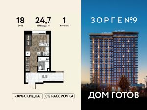"Зорге 9" — готовые апартаменты бизнес-класса на Ходынке. 10 минут до Москва-Сити. Архитектура: 3 современных корпуса с фасадами в стиле архитектуры Нью-Йорка и с сервисами премиальных отелей, высотой до 23 этажа. Строгие линии, панорамные окна создают ощущение неподдельной роскоши и комфортной жизни в сердце мегаполиса. Проект награжден авторитетной премией European Property Awards. Резиденции: Свободная планировка, небольшая глубина этажа, огромные панорамные окна в пол до 3,6 м и высота потолков до от 3,3 до 4,3 м позволяют реализовать самые смелые концептуальные идеи и создать идеальный интерьер с учетом всех пожеланий. Вдохновляющие виды на город украсят ваш апартамент лучше любой картины. Есть возможность приобретения дизайн-проекта и полной меблировки апартаментов от партнеров девелопера. Расположение: 3 мин. пешком до парка Березовая роща 10 мин. пешком до Ходынского поля 10 мин. до ТЦ Авиапарк 30 минут до Шереметьево 10 мин до Москва-Сити или 1 станция до Москва-Сити 5 минут до ТТК 4 станции метро в шаговой доступности: 6 мин м. Полежаевская (фиолетовая ветка) 7 мин МЦК Зорге (МЦК) 7 мин м. Хорошевская (голубая ветка) 10 мин МЦК Хорошёво (МЦК) Благоустройство: Собственный парк 2 га с амфитеатром и поющими фонтанами. В парке высажено 136 деревьев и более 11 000 кустов и мелких растений из немецких питомников. Площадка для йоги и воркаут-зона со спортивными площадками. Теннисные столы и детский плейхаб Две башни Авторское гранд-лобби В лобби предусмотрена лаундж-зона, чайная с камином, комната для хранения велосипедов и колясок. Доступ по системе FACE ID. В отделке лобби и лифтовых холлов использован декоративный камень итальянского бренда Atlas Concorde Пентхаусы На верхнем уровне комплекса расположены роскошные просторные пентхаусы с высотой потолка до 4,2 метра и панорамными окнами до 3,6 метров, открывающими великолепные виды на столицу. Пентхаусы с выходами на собственные приватные террасы на кровле, площадью от 150 кв. м являются жильем high-уровня, демонстрирующим высокий статус владельца.