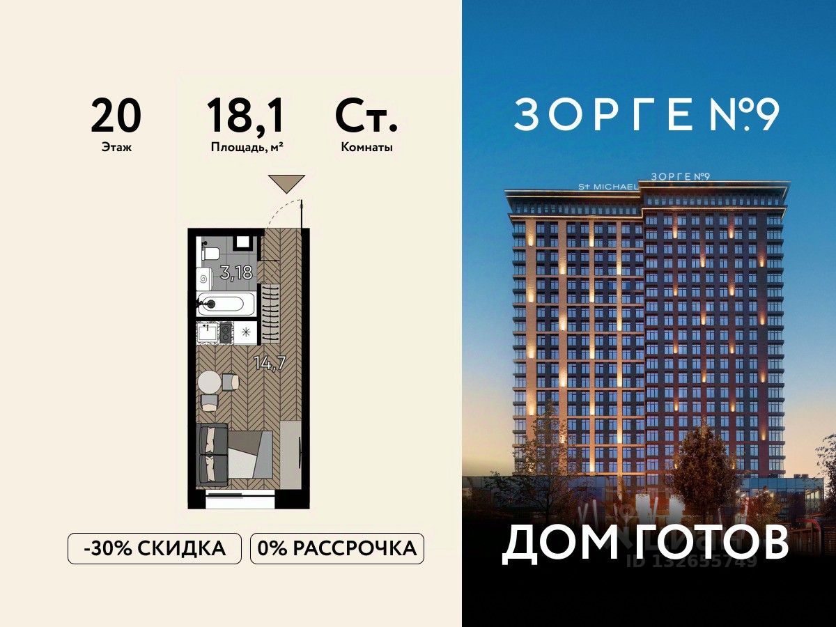 "Зорге 9" — готовые апартаменты бизнес-класса на Ходынке. 10 минут до Москва-Сити. Архитектура: 3 современных корпуса с фасадами в стиле архитектуры Нью-Йорка и с сервисами премиальных отелей, высотой до 23 этажа. Строгие линии, панорамные окна создают ощущение неподдельной роскоши и комфортной жизни в сердце мегаполиса. Проект награжден авторитетной премией European Property Awards. Резиденции: Свободная планировка, небольшая глубина этажа, огромные панорамные окна в пол до 3,6 м и высота потолков до от 3,3 до 4,3 м позволяют реализовать самые смелые концептуальные идеи и создать идеальный интерьер с учетом всех пожеланий. Вдохновляющие виды на город украсят ваш апартамент лучше любой картины. Есть возможность приобретения дизайн-проекта и полной меблировки апартаментов от партнеров девелопера. Расположение: 3 мин. пешком до парка Березовая роща 10 мин. пешком до Ходынского поля 10 мин. до ТЦ Авиапарк 30 минут до Шереметьево 10 мин до Москва-Сити или 1 станция до Москва-Сити 5 минут до ТТК 4 станции метро в шаговой доступности: 6 мин м. Полежаевская (фиолетовая ветка) 7 мин МЦК Зорге (МЦК) 7 мин м. Хорошевская (голубая ветка) 10 мин МЦК Хорошёво (МЦК) Благоустройство: Собственный парк 2 га с амфитеатром и поющими фонтанами. В парке высажено 136 деревьев и более 11 000 кустов и мелких растений из немецких питомников. Площадка для йоги и воркаут-зона со спортивными площадками. Теннисные столы и детский плейхаб Две башни Авторское гранд-лобби В лобби предусмотрена лаундж-зона, чайная с камином, комната для хранения велосипедов и колясок. Доступ по системе FACE ID. В отделке лобби и лифтовых холлов использован декоративный камень итальянского бренда Atlas Concorde Пентхаусы На верхнем уровне комплекса расположены роскошные просторные пентхаусы с высотой потолка до 4,2 метра и панорамными окнами до 3,6 метров, открывающими великолепные виды на столицу. Пентхаусы с выходами на собственные приватные террасы на кровле, площадью от 150 кв. м являются жильем high-уровня, демонстрирующим высокий статус владельца.