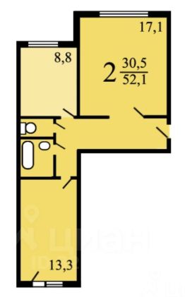 Общей площадью 52,1 кв.м., две изолированные комнаты 17,1 кв.м. и 13,3 кв.м., просторная кухня 9 кв.м.,раздельный санузел, гардеробная. Отличная планировка с окнами на две стороны.