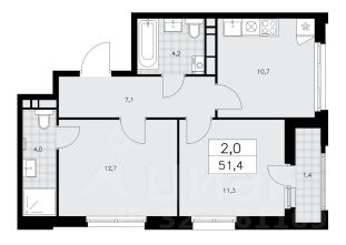 Состоит из холла, кухни, двух изолированных комнат, лоджии и двух совмещенных санузлов