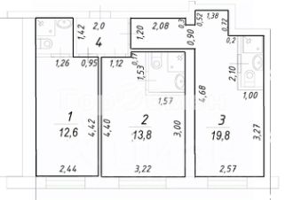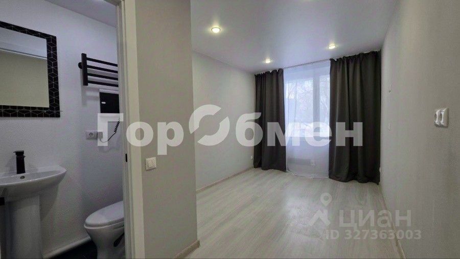 Высокий первый этаж 14-ти этажного дома. Студия 3 на схеме. Площадь 19,8 кв.м, санузел совмещенный, выводы под кухню, установлены счетчики воды и электроэнергии. Окна выходят во двор.