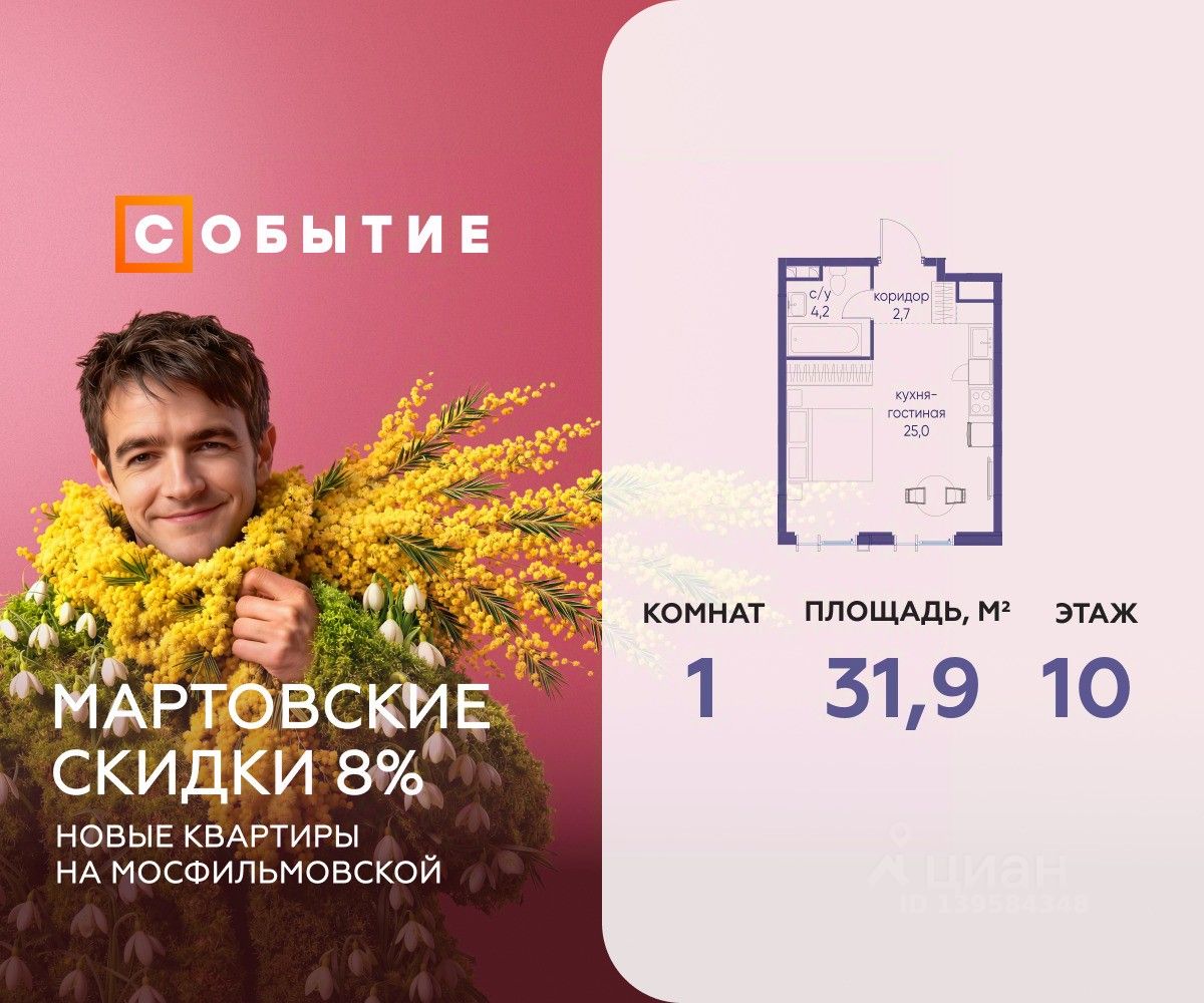 В продаже студия от застройщика. Общая площадь 31.9, жилая 21.5, кухня 10.4. Квартира расположена на 10 этаже жилого квартала "Событие-6", корпус 2, Секция 4. Квартира без отделки. Срок сдачи: 4 кв. 2029 года.