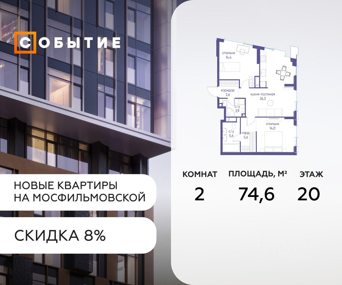 В продаже 2-к квартира от застройщика. Общая площадь 74.6, жилая 11.3, кухня 63.3. Квартира расположена на 20 этаже жилого квартала "Событие-6", корпус 2, Секция 1. Квартира без отделки. Срок сдачи: 4 кв. 2029 года.