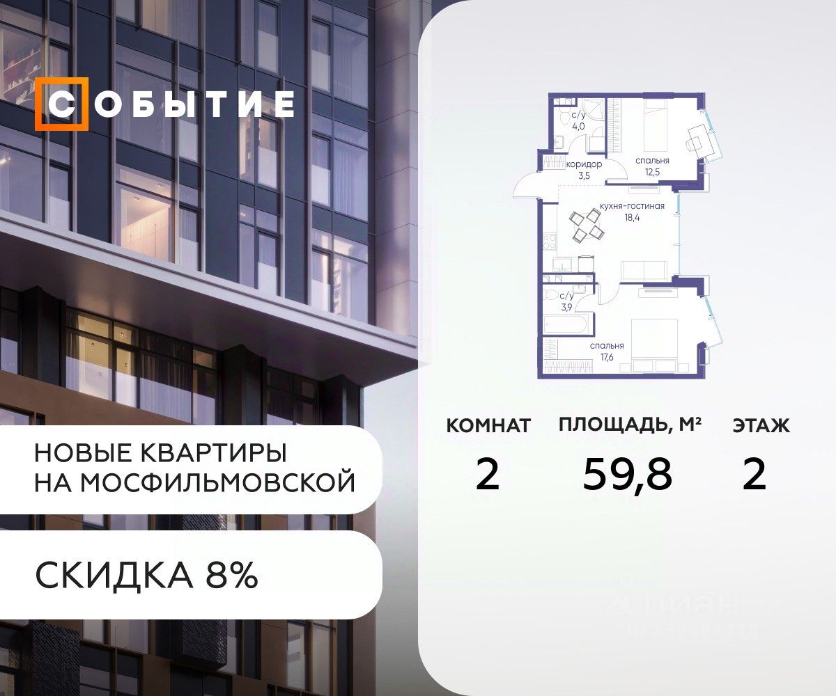 В продаже 2-к квартира от застройщика. Общая площадь 59.8, жилая 18.3, кухня 41.5. Квартира расположена на 2 этаже жилого квартала "Событие-6", корпус 2, Секция 2. Квартира без отделки. Срок сдачи: 4 кв. 2029 года.