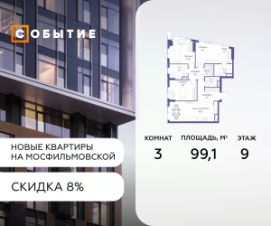 В продаже 3-к квартира от застройщика. Общая площадь 99.1, жилая 23, кухня 76.1. Квартира расположена на 9 этаже жилого квартала "Событие-6", корпус 2, Секция 1. Квартира без отделки. Срок сдачи: 4 кв. 2029 года.