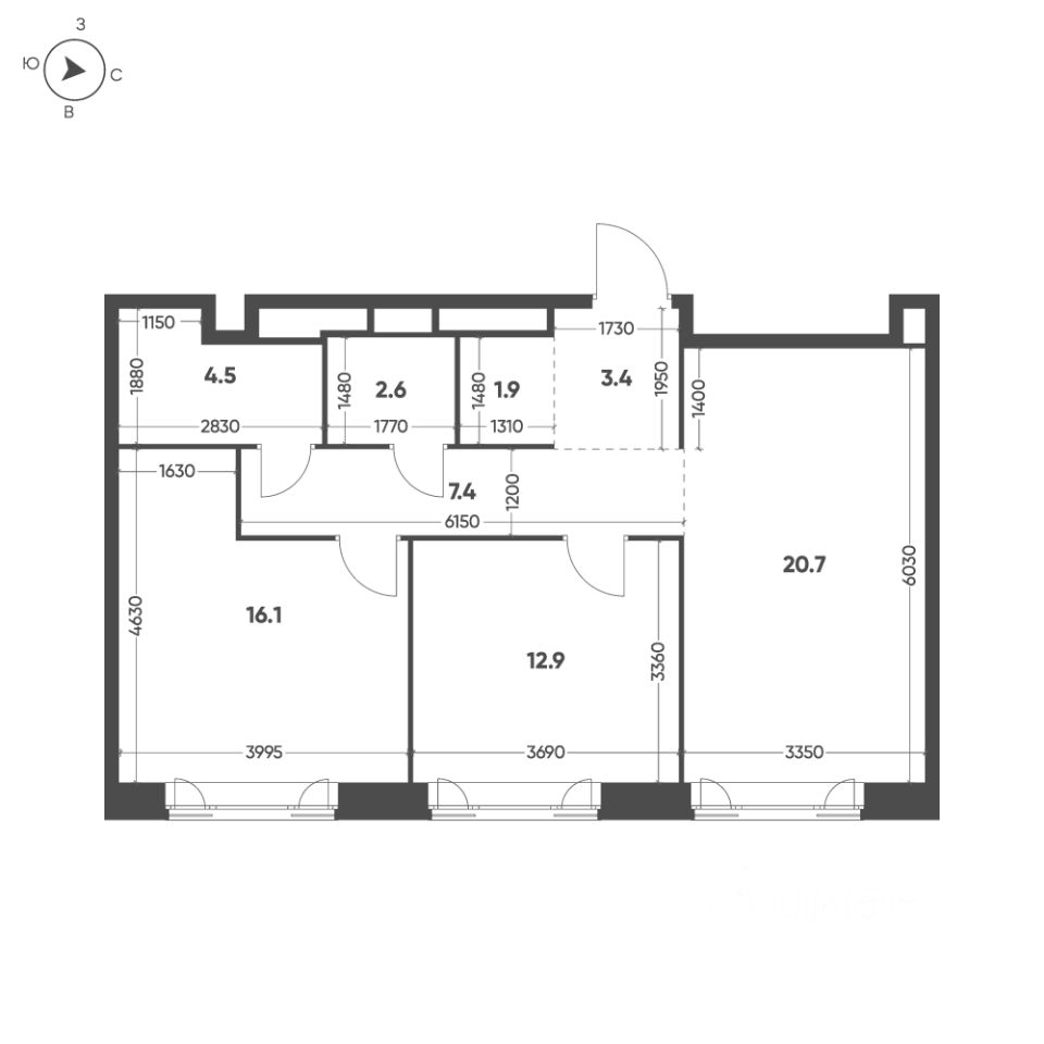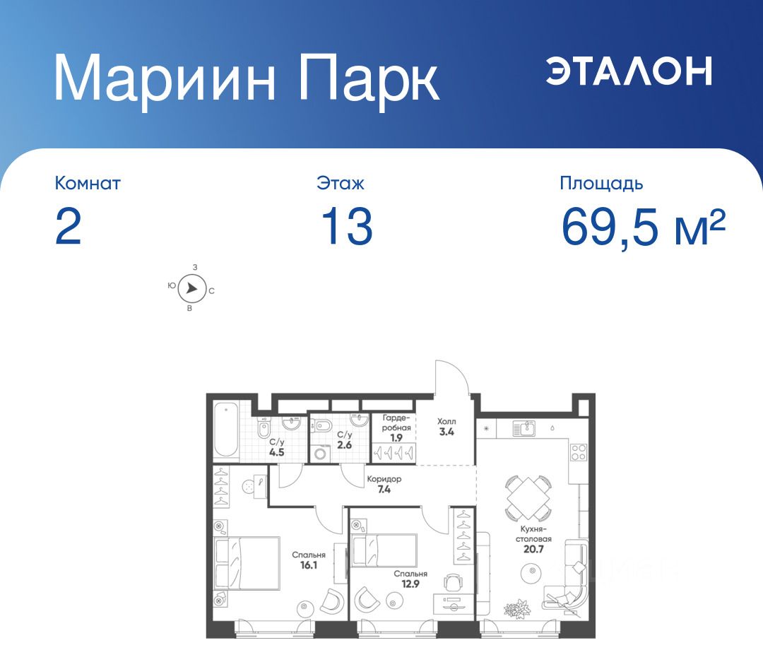 Общая площадь квартиры — 69.5 кв. м, этаж 13 из 16.