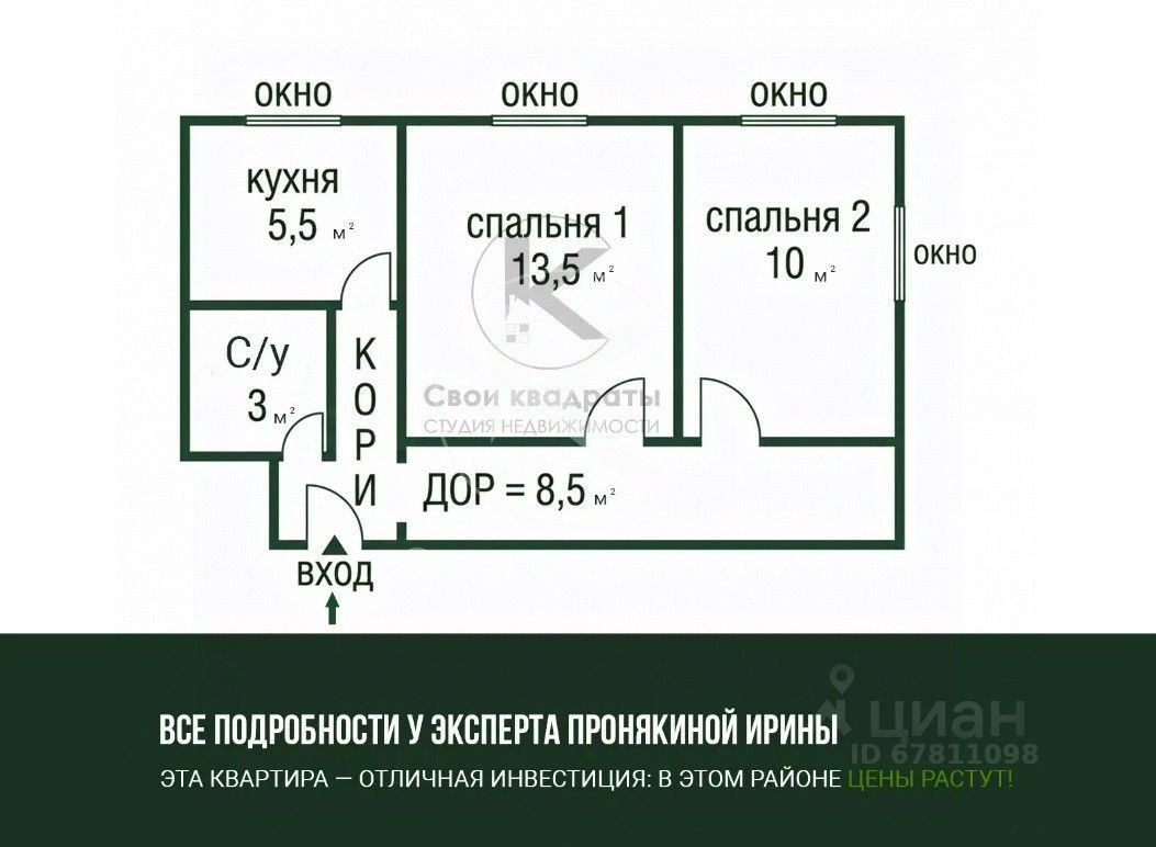 • Планировка: две изолированные комнаты (13.5 и 10 м²), просторный коридор (8.5 м²), разделяющий пространство, совмещённая ванная комната (3 м²), кухня (5.5м²). Балкона нет.